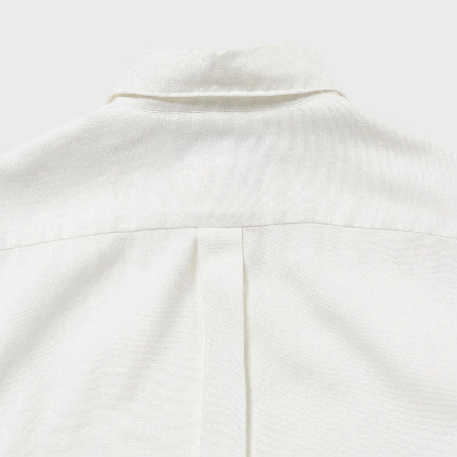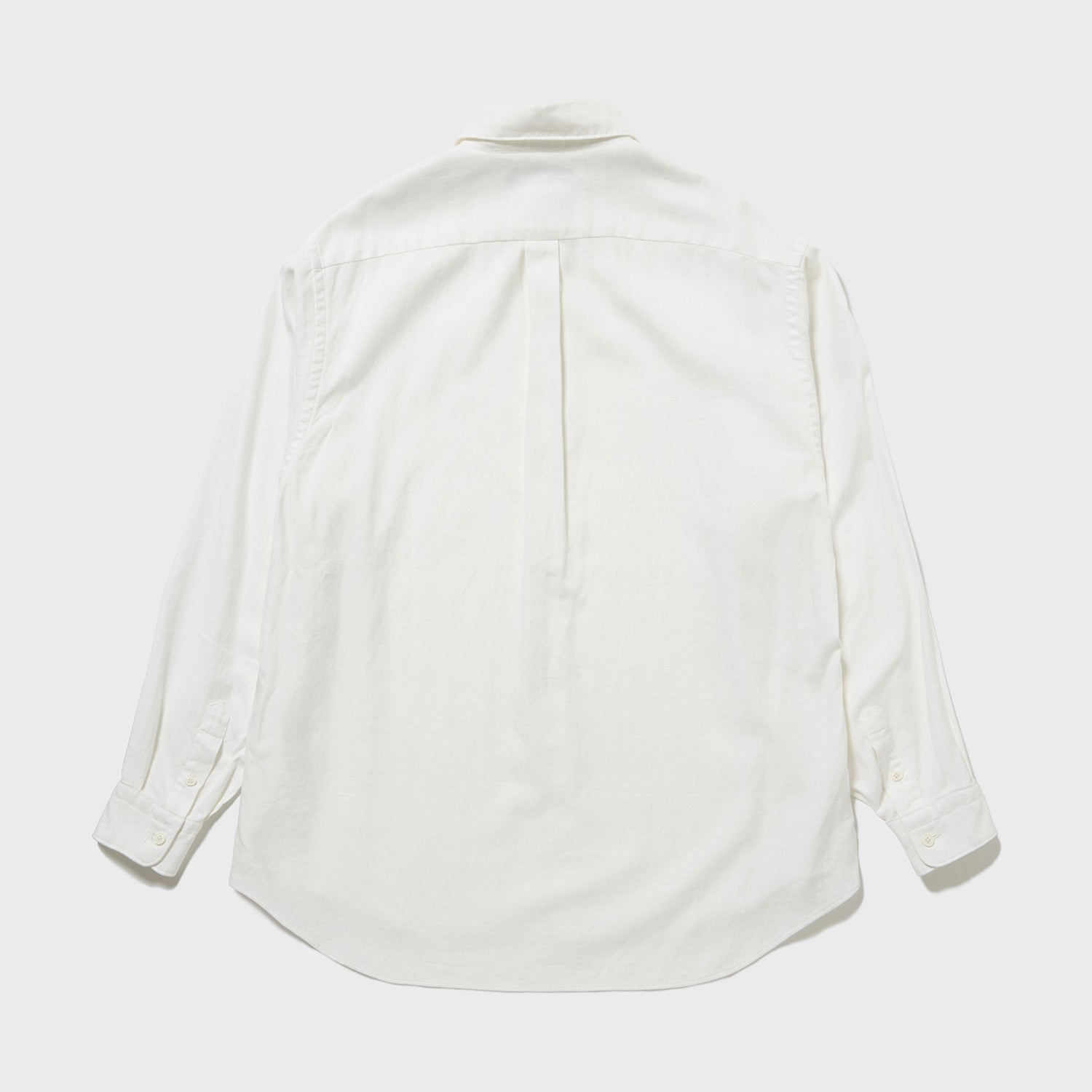通常、ヨコ糸には太番手の糸を使う事の多いオックスフォード生地ですが今回は中細番手の双糸を2本引きそろえて打ち込むことで、ざっくりした目風を出しながら組織の中で各々の糸が自由に動くようにすることで生地に柔らかさが出るようにしています。仕上げにはピーチ起毛を施し、海島綿の持つしっとりとした究極の質感を存分に味わえるように仕上げました。