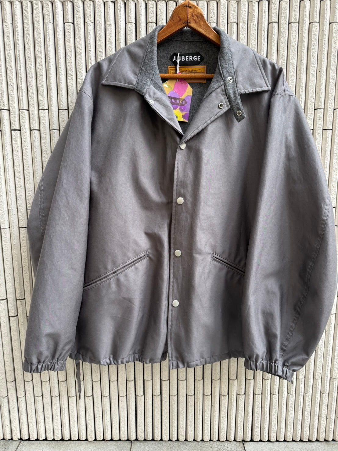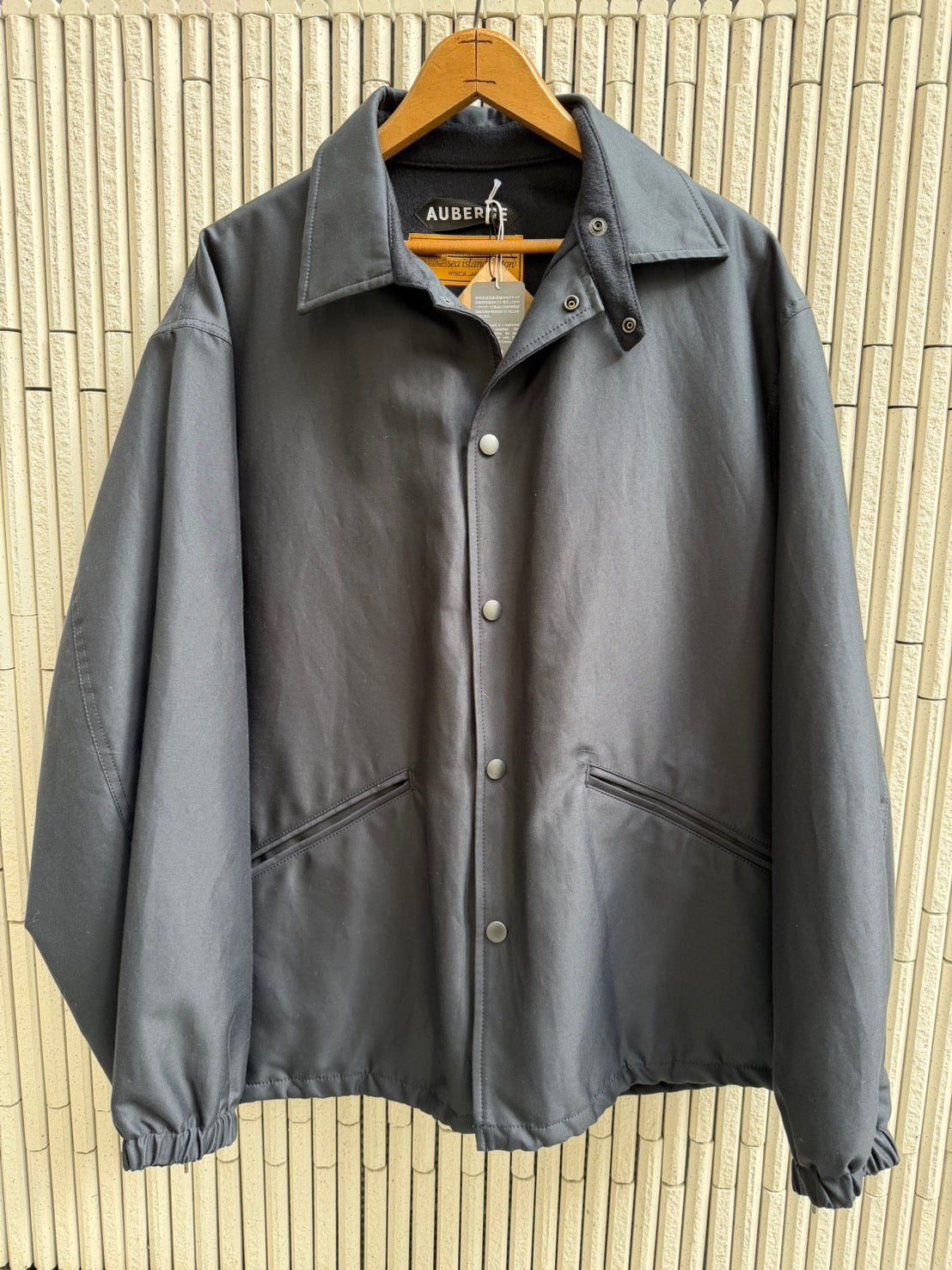 80年代チャンピオンやL.L.BEANなどのコーチジャケットをベースにデザインしました。いわゆるアメリカのコーチジャケット(グランドジャケット)タイプですが、袖を若干太めにして袖口ギャザーでエレガントな雰囲気に。このスクールユニフォームっぽさとシーアイランドコットンとシルクの光沢、袖口にゴムを入れたギャザーによる膨らみはありきたりな1着から1線を画す。身頃裏地にはカシミヤをはって保温性を高めています。