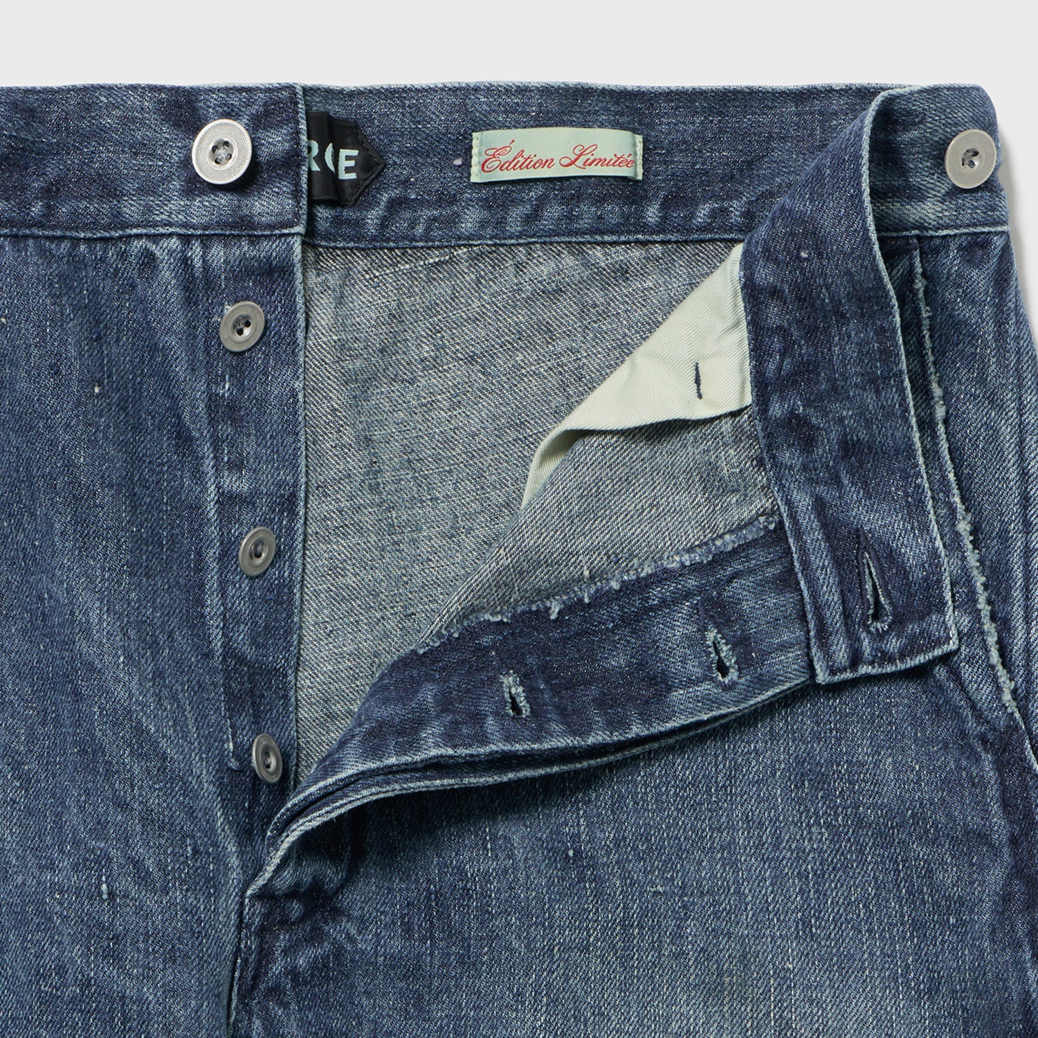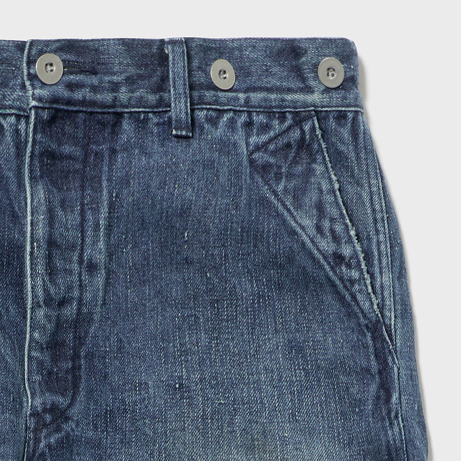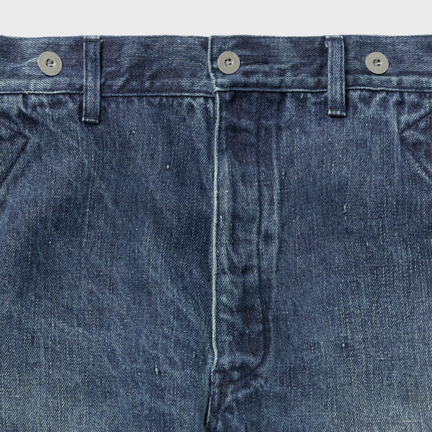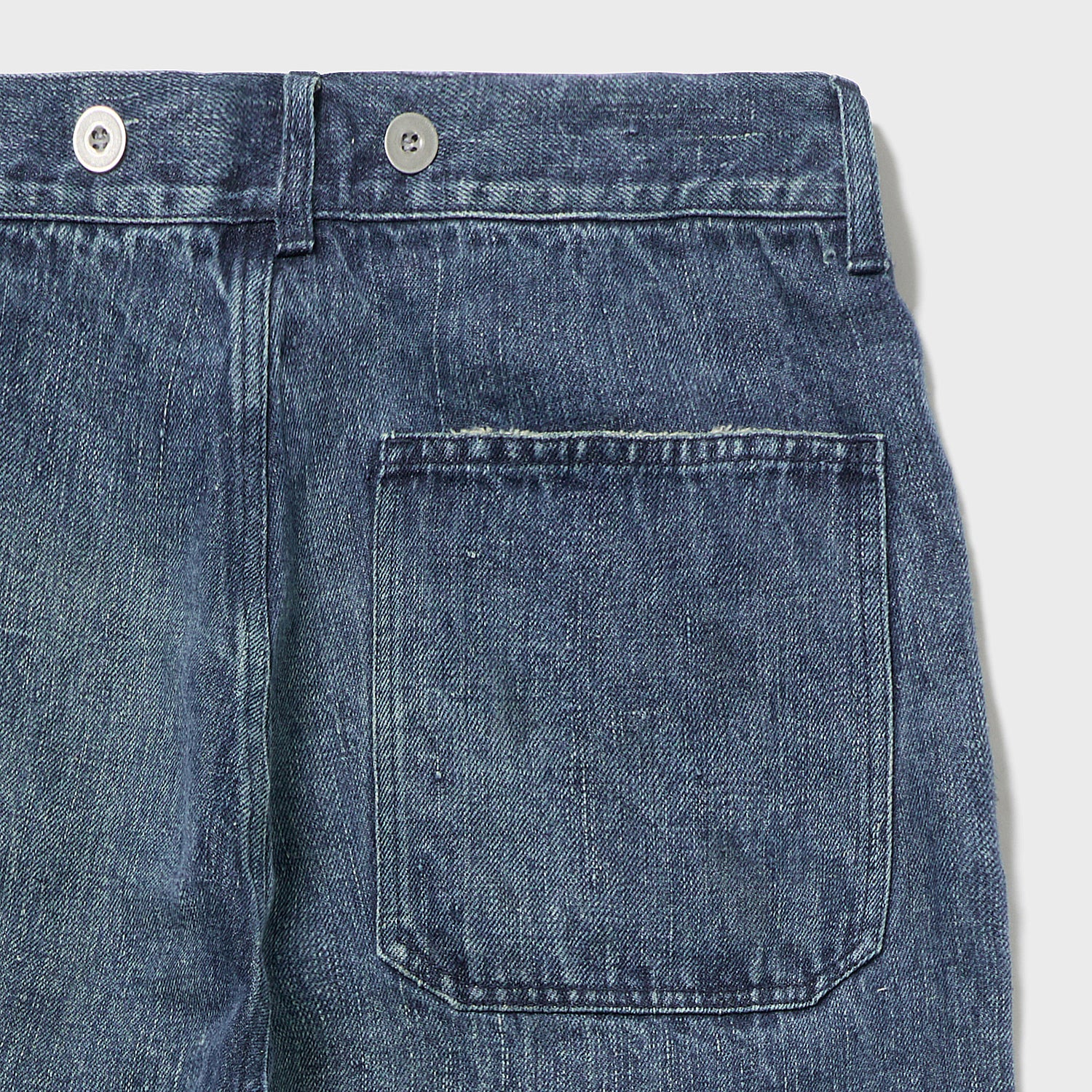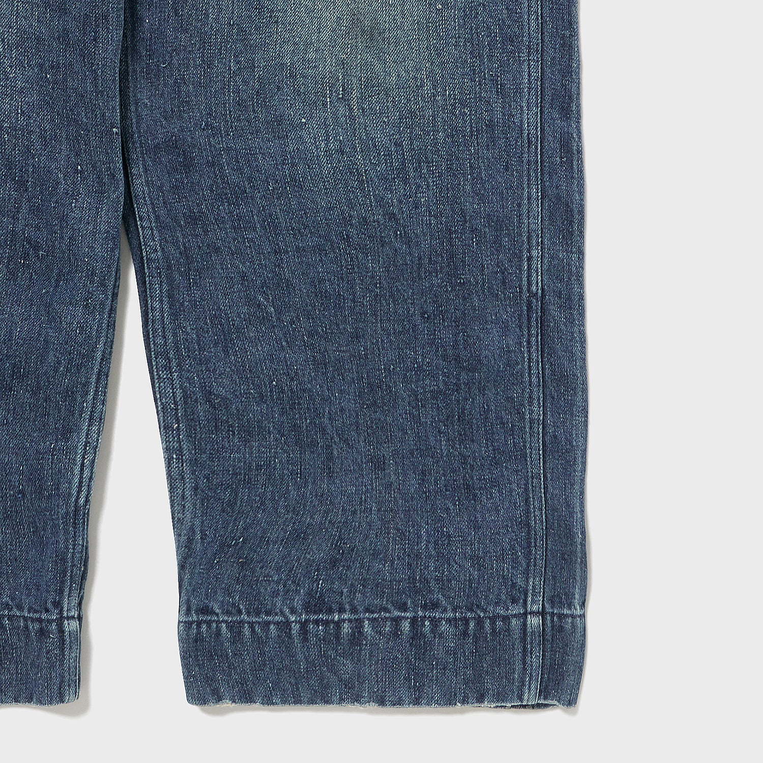 こちらもUKファブラム社のインディゴワークスラックスをデザインベースにしております。シルエットはAUBERGEの41チノに近いワイドバギータイプで素材の迫力と相まって存在感のある1本です。加工は岡山・豊和でのスーパーリアル洗い。
